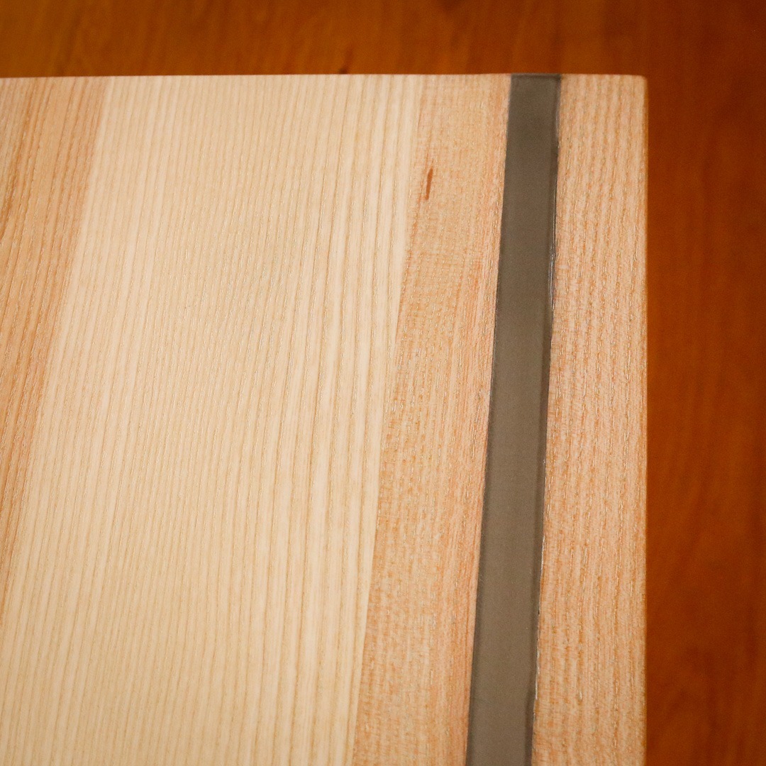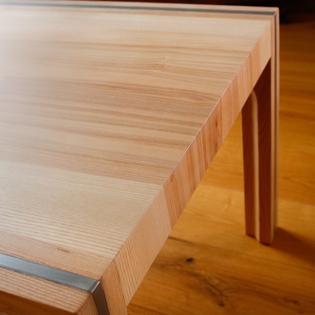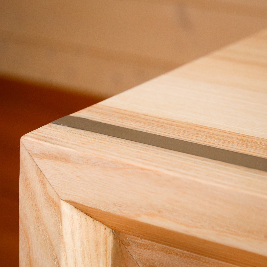 La table est en frêne « olivier » massif assemblé en coupe d’onglet avec raccord de fil. Sébastien a incrusté une bande d’étain de 1.6mm dans l’espace aménagé sur les cotés. La finition est à l’huile Rubio® « White 5% »