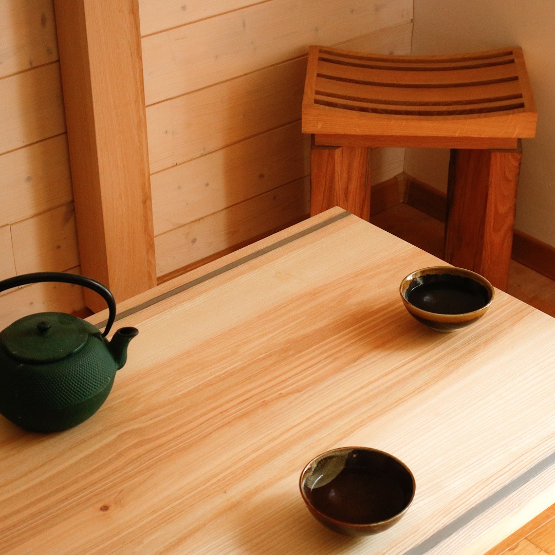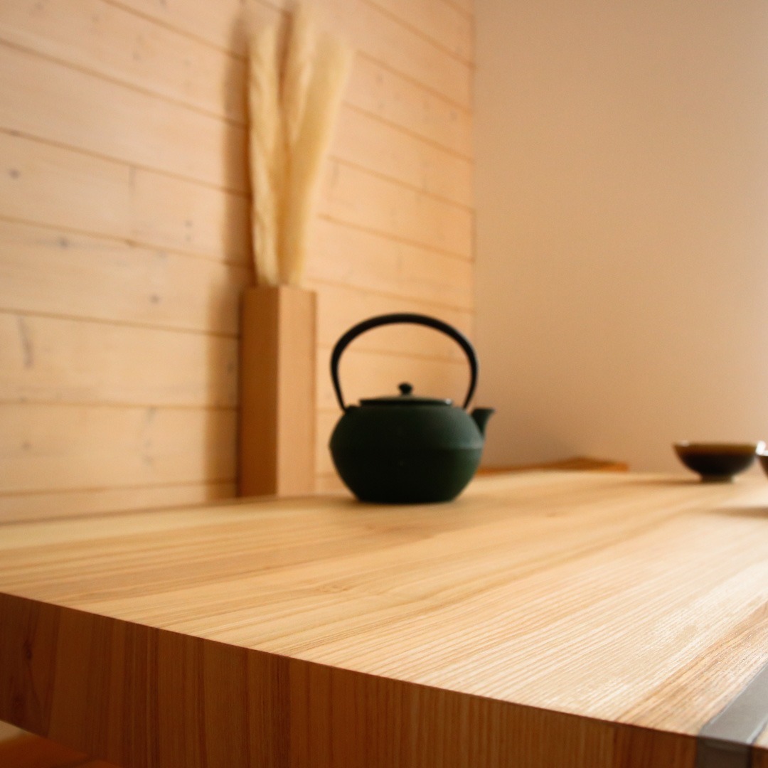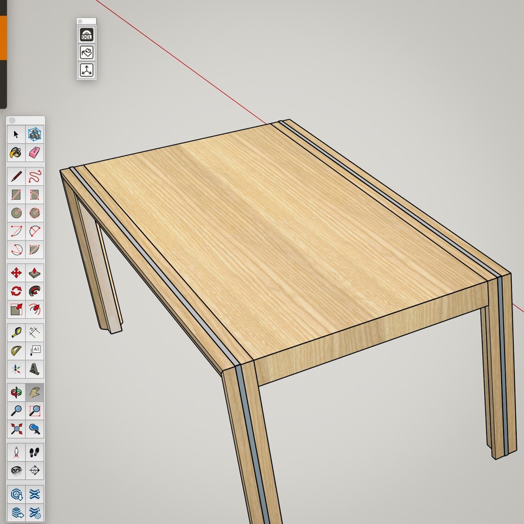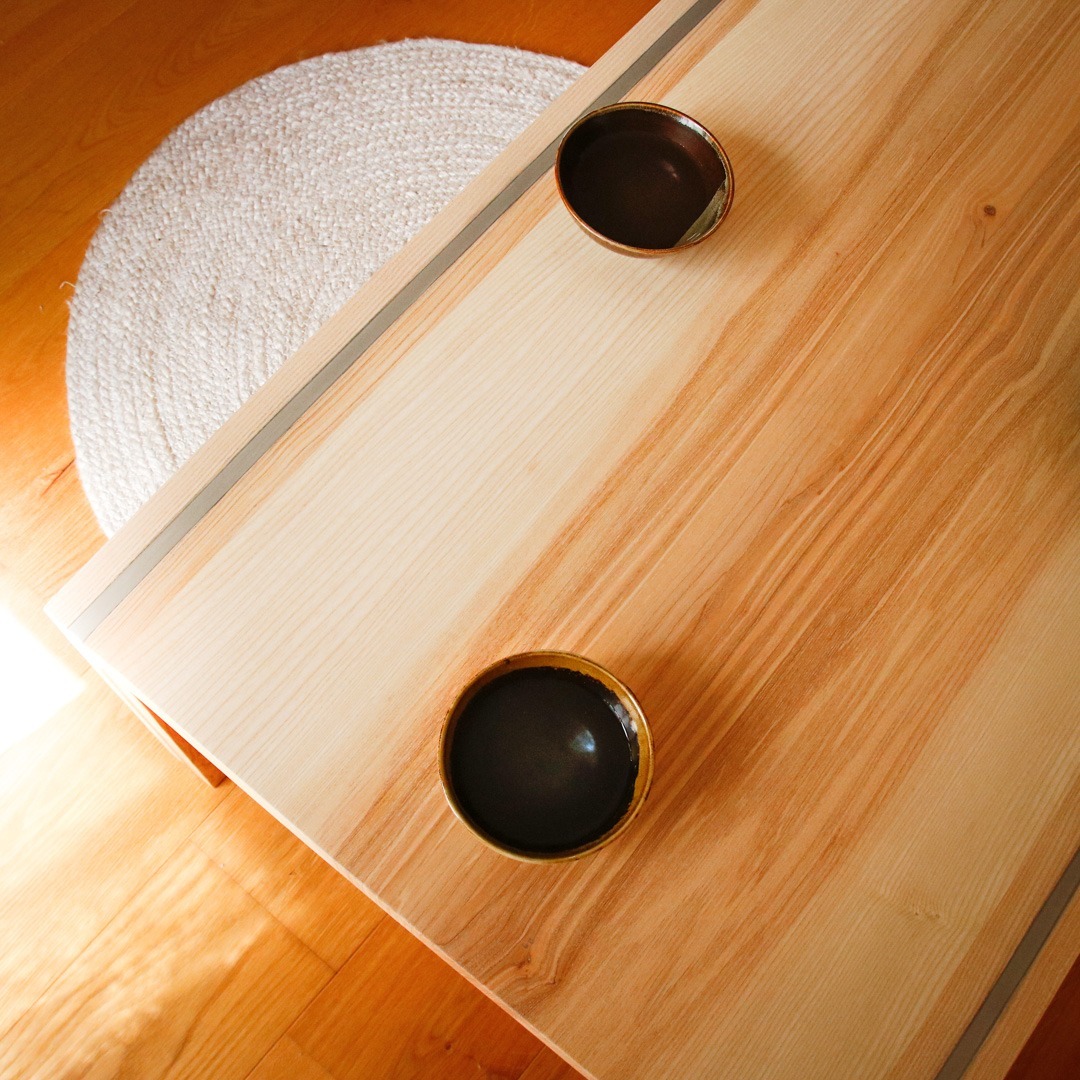 La table est en frêne « olivier » massif assemblé en coupe d’onglet avec raccord de fil. Sébastien a incrusté une bande d’étain de 1.6mm dans l’espace aménagé sur les cotés. La finition est à l’huile Rubio® « White 5% »